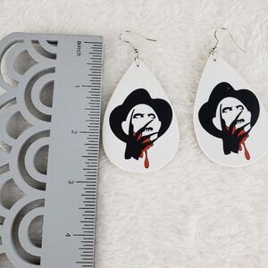 White faux leather with Freddy Krueger graphic on the front. There is and imperfection in his hat in one earring (see pic 2)
