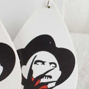 White faux leather with Freddy Krueger graphic on the front. There is and imperfection in his hat in one earring (see pic 2)