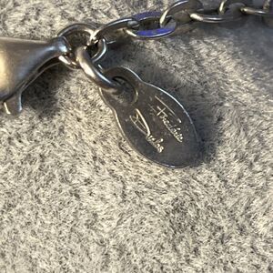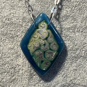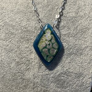 The Frederic Duclos Dichroic Art Glass Pendant on .925 Sterling Chain is a stunning piece of jewelry designed in Italy. The multicolor glass pendant is signed by the brand and features a lobster closure. The 18-inch necklace is made of sterling silver with a rolo chain, making it a high-quality and stylish accessory perfect for various occasions such as engagements, weddings, anniversaries, and birthdays. This unique pendant exudes beauty, artistry, and a chic design that is sure to make a statement.