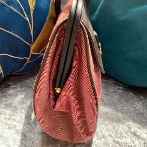 RARE!!! Frederic Fekkai leather and tweed chevron purse in red, beige and brown. Excellent piece! Vintage circa 2001. Clean. Inside has a zippered pocket. Has some wear on the edges of the leather and a small stain on the side but can’t see it at all as it’s hidden in the folds. Please feel free to ask any questions!