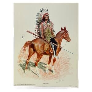 This vibrant lithographic reproduction print features the iconic image of a Sioux chief on horseback, created by legendary Western artist Frederic Remington. A must-have for collectors of Western Americana or vintage art.