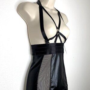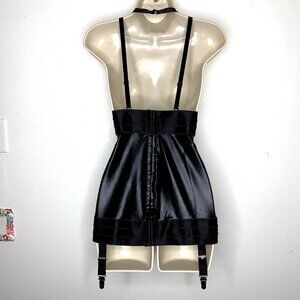Frederick's of Hollywood PETRA COLLECTION Satin Wet Look OPEN CUP Underbust BLACK HARNESS BUSTIER with Strappy Neckline, Garters and Matching Mesh Panties!