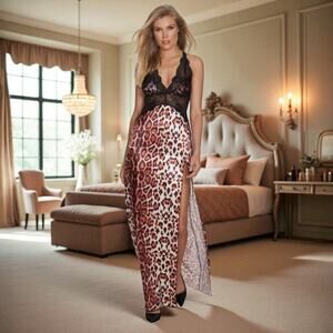 Frederick's Of Hollywood Rosalina Rose Animal Print Lace Satin Open Low Back Nightgown Maxi Gown. Adjustable straps, Elastic Band for stretch, High Side Slit. G-String Thong included.