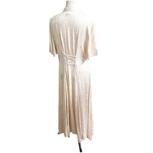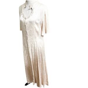 The product is a vintage Frederick's of Hollywood nightgown in size 16, featuring an embedded floral pattern with a beige color and crochet accents at neckline . This gown has a V-neckline and a button front closure with a lace-up detail at back. It is classified as a kimono-style gown, suitable for all seasons and has a theme of designer, elegant, 80s, 90s, and old money. The garment care instructions recommend a hand wash only to maintain its vintage charm.