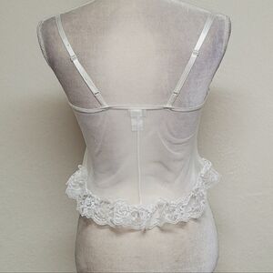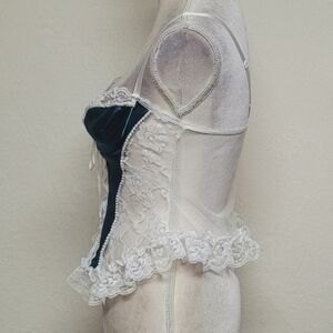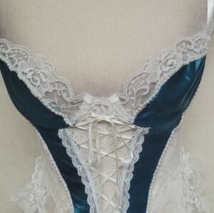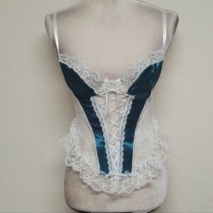 Frederick's Of Hollywood Vintage White Lace Teal Satin Lace-up Corset Lingerie.