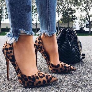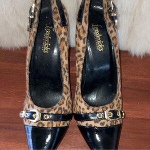 Leopard Animal Print Stilettos Heels by Fredericks of Hollywood size 7 1/2. Very sexy 4” heel height. Brown and tan sueded fabric. Black patent capped toes and heels with gold buckle detailing hardware. Excellent like new condition.