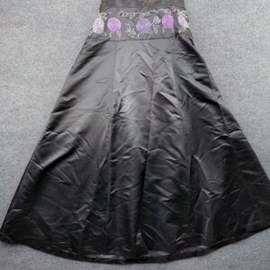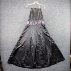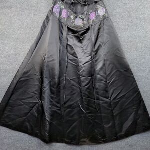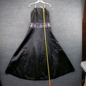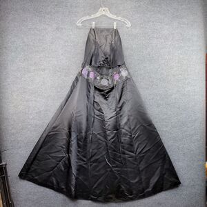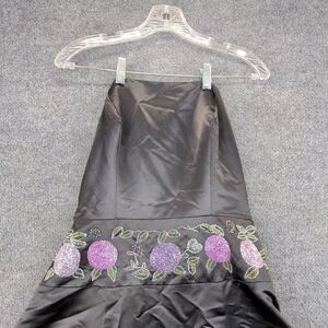 Elegant strapless dress. Black fabric with purple floral accents. Perfect for evening wear.