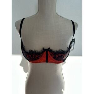 This bra is sexy and luxurious. It features an open-cup underwire bra that comes in vibrant orange and black eyelash lace that overlays the bra. The material is satin which has a little stretch satin. This lace shelf bra also features an adorable satin bow. The band is a comfortable mesh material. The straps are adjustable and the cups are lined and have underwire. This is an AU is the equivalent of US size XS. New with tags.