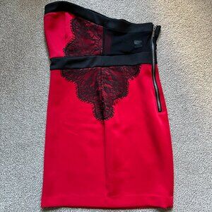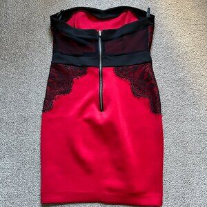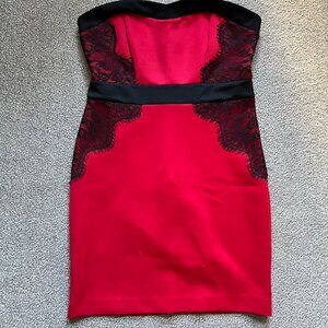 Frederick's of Hollywood Dress Mini Red Strapless Scuba Bodycon Black Lace | L