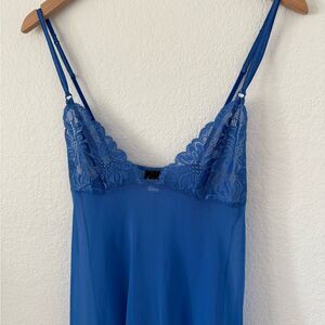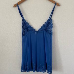Keywords: Frederick’s of Hollywood cami, lace babydoll top, blue lingerie, sheer camisole, vintage Frederick’s, Y2K lingerie, sexy sleepwear, sheer lace tank, adjustable straps, cobalt blue cami, romantic nightwear, 90s lingerie top