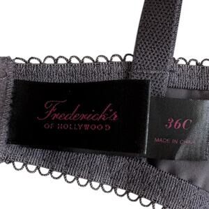 Elegant Frederick’s of Hollywood push-up style bra in a deep charcoal gray lace overlay with padded underwire cups and scalloped lace trim. Features an adjustable strap, hook-and-eye closure, and a stunning rhinestone heart charm at the center front for a touch of sparkle.