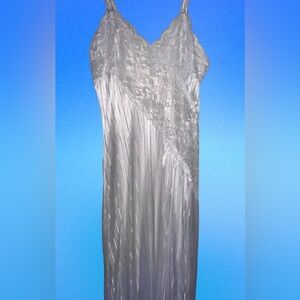 100% nylon with lacy upper, satiny feel, and 30” side slit (on one side)