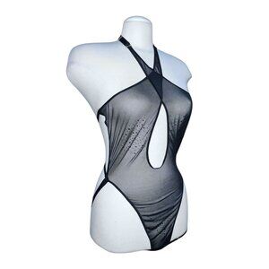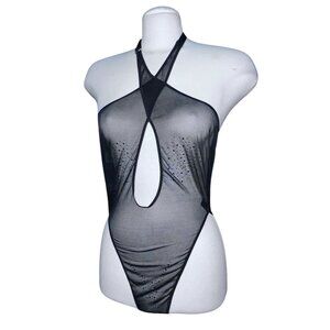 This is a Fredericks of Hollywood NWT Emery Embellished Mesh Thong Teddy Black Lingerie