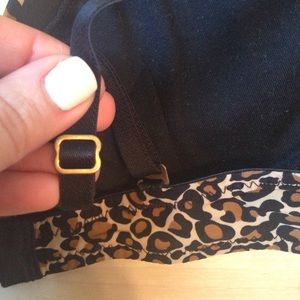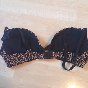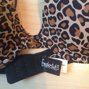 Beautiful leopard print Frederick's of Hollywood Exxtreme Cleavage bra. Gently worn. Hardware has darkened over time, otherwise it's in almost perfect condition! Removable push-up padding adds about 1 cup. 2 hook closure. Straps are fully detachable and can be worn in multiple ways (crossed, halter, one strap, strapless)