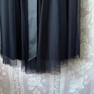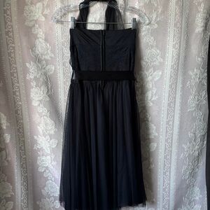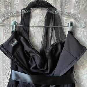 Stunning Fredericks of Hollywood black halter dress with mesh overlay. Leash over bust and around halter neck. Three layers mesh, lining and tulle. Satin tie bow at waist and zipper in back. Vintage gem! Excellent condition!