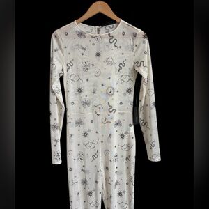 Exclusive collaboration piece. Frederick’s of Hollywood X Forever 21 Mesh Celestial Print Jumpsuit. This mesh knit jumpsuit features an allover celestial print with snake, butterfly, & cat details, a round neckline, long sleeves, and a back keyhole with single button loop closure.
