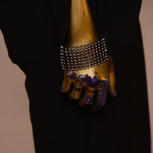 Black evening dress from Frederick's of Hollywood. Top of shoulders are accentuated with thick faux rhinestone straps. Loose on top then dropping down to a low fitted elasticized hip fitted styling. Sleeves are cut out at the shoulders, following downward to slits that end at the wrists with faux rhinestone cuffs. Back of dress drapes in a magnificent low cowl draping that ends at the nape of the back. Very sexy and understated chic. Nice go-to dress. Material: 95% polyester, 5% spandex.
