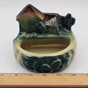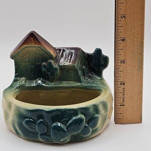 Vintage 1950s Fredericksburg Art Pottery hacienda or southwestern cottage double planter, wall pocket. Southwest house surrounded by cactus in the desert. There are two openings (one in front, one higher above the roof of the house that is part of the same base. The planter is a creamy yellow color with reddish brown and green air brush accents. There are no maker’s mark. Could be used as a wall pocket, catchall, sponge holder, or perfect planter for succulents or air plants.
