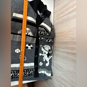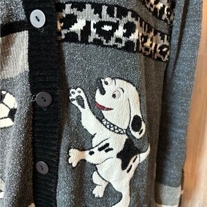 Stylish Fredo women's sweater. Features playful dog design. Gray and black with cream accents. Button-up front. Features cute playful puppy. Is missing size tag bit it fits like a large. See pics for measurements.