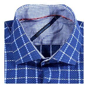 Fredrick Martin Button Up Men’s Shirt, Blue & White Plaid Textured Cotton Fabric, Patch Pocket, Rear Red Embroidered Logo, Long Sleeve, Button Round Cuff, Business Casual, Party Going Out