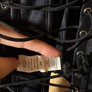 Fredrick’s of Hollywood: Black, lace trimmed corset. Size 34: Sizing is based off of bra band, not cup or waist measurement. Strings have been shortened, but can be replaced. Side closure. Has been worn a lot and has been a great piece.