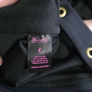 Unleash your glamorous side by the water with this edgy and captivating Frederick's of Hollywood bikini set! This complete set, in a versatile size large, comes in a classic black color, elevated by bold brass grommet detailing for a unique, hardware-inspired look.