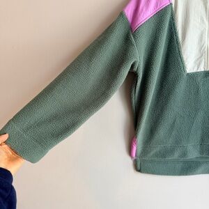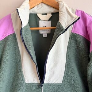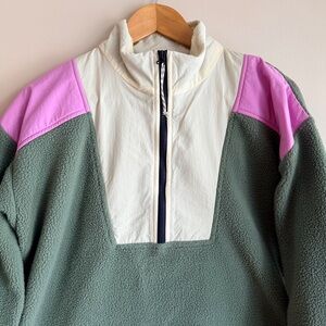 Free Assembly Women's Half-Zip Sherpa Fleece Pullover, Sage Green/Pink/White, Size M. This cozy colorblock sherpa features a functional half-zip closure with a contrast nylon upper panel in white and pink accents. Designed with a high neck and a relaxed fit for a casual, outdoorsy aesthetic. Made with soft, textured fleece fabric to keep you warm during cooler seasons. Excellent pre-owned condition with no visible stains or signs of wear.