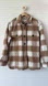 Chic plaid jacket with button-up front. Features brown and cream tones. Ideal for layering