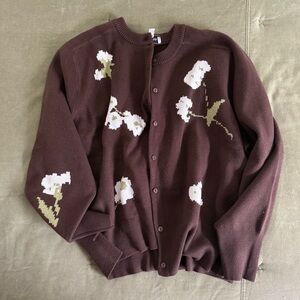 Chic brown cardigan with elegant floral designs, perfect for adding a touch of style to your wardrobe.