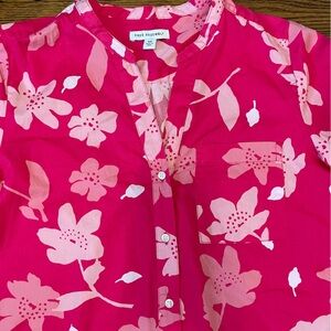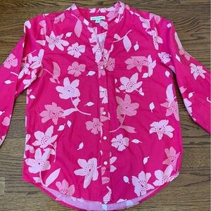 This is a Free Assembly ladies blouse, a beautiful pink color. The blouse has a V cut in the front and buttons down. There is elastic at the wrist and a pocket on the front of the upper chest. Blouse is 100% cotton and a size extra small.
