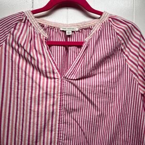 Free Assembly women's striped top in pink & white. Collared. V-neck. Long sleeves. Buttoned cuffs. Ruffle hem. Contrasting lighter pink. In good used condition. No stains, tears or holes.