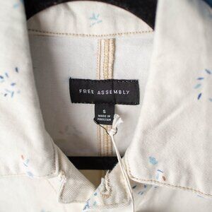 Add a soft, feminine touch to your casual wardrobe with this Free Assembly Denim Barn Jacket. Featuring a light cream base with delicate floral sprigs in blue and rust tones, this utility-inspired jacket combines structure and comfort beautifully. Crafted from a cotton stretch blend for ease of movement and designed with multiple front pockets for a functional yet stylish look.