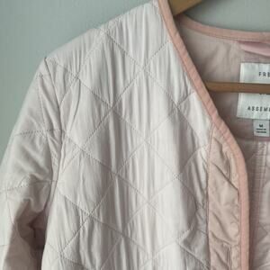 The Free Assembly Women's Quilted Cinched Waist Liner Jacket in Mauve Chalk, size Medium, is a stylish and versatile addition to any woman's wardrobe. Made from durable nylon, this basic jacket features a cinched waist for a flattering fit. The quilted accents add a touch of texture and sophistication, making it a great choice for everyday wear or dressing up for a special occasion. The soft pink color is perfect for adding a pop of color to any outfit, making this jacket a must-have staple for any fashion-forward woman.