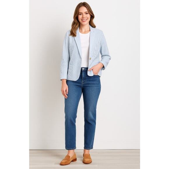 Elevate your everyday or workwear wardrobe with this Free Assembly light blue and white striped cotton blazer jacket. Designed with a subtle seersucker-inspired texture, this lightweight blazer features a classic notched lapel, single-button front closure, and a fully lined interior for comfortable structure. Perfect for layering over blouses, tees, or dresses for a polished yet relaxed look.