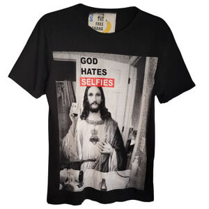Free Banana “God Hates Selfies” graphic T-shirt in men’s size Small. This bold, satirical design features a selfie-taking Jesus, blending streetwear with provocative humor. Crafted from soft 100% cotton and made in Turkey, it’s a collectible piece for fans of edgy fashion and meme-inspired apparel.