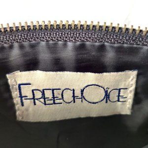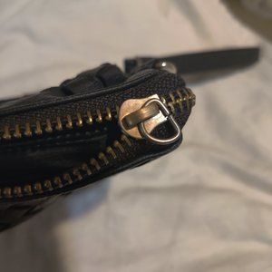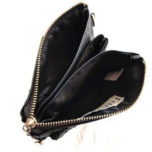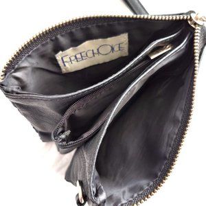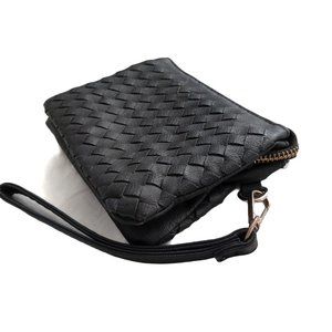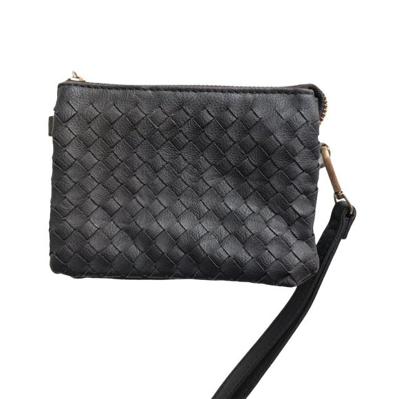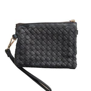 Free Choice black woven wristlet; removable wrist strap; 3 compartments with zipper closures; lined interior.