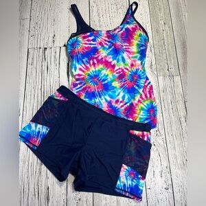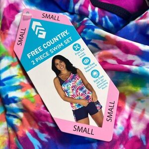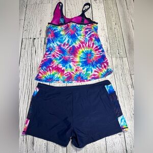 This vibrant and stylish tankini set from Free Country is perfect for any summer beach day! The set includes a tank top and swim shorts, both featuring a colorful tie-dye pattern. The top has a built-in bra and adjustable straps for a comfortable fit, while the shorts have a swimwear bottom style.