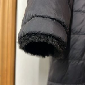 NWOT Free Country medium weight puffer jacket with super soft faux fur lining. Black. Mid-length. Snap closure side pockets and hood with elastic adjustable pulls.