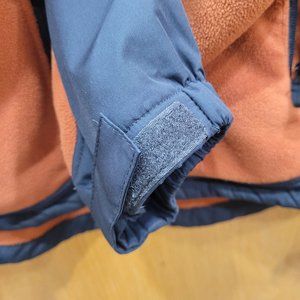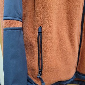 Free Country Grey & Rust Full Zipper Fleece Medium-weight Jacket. The rust portion is fleece and the gray contrast is polyester matte fabric . It is marked an Xtra large, but fits like a large. 3 zippered pocket in front. Velcro adjustable cuffs. 25" pit to pit, 28" long in the front, 29" in the back. Sleeves are 24" from pit to cuff. Excellent preowned condition. No pilling, snags, spots.