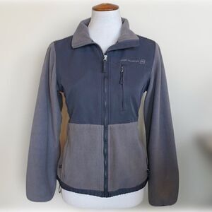 FREE COUNTRY MIXED MEDIA FLEECE JACKET INTO TURTLENECK FULL ZIP SMALL silver and gray , 2 zip pockets and a chest zip pocket, elastic tighteners on base. Loose threads. Pen mark on sleeve. Spot on right side.