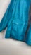 Attached hood, full length front zipper, storm flap with snaps on the teal side.