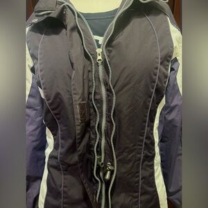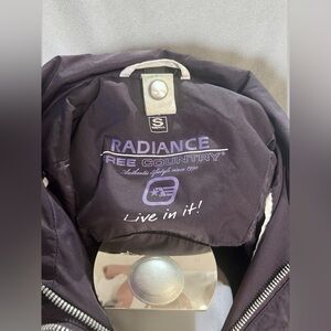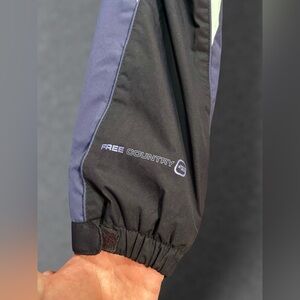 Purple and white colorblock windbreaker with a hood from Free Country. Size small and features the Radiance technology which is wind and water resistant. Full zip front with snap closures and adjustable hood. Great for layering or wearing on its own when the weather gets unpredictable. Clean condition and ready to ship. Perfect for outdoor activities or just everyday wear.