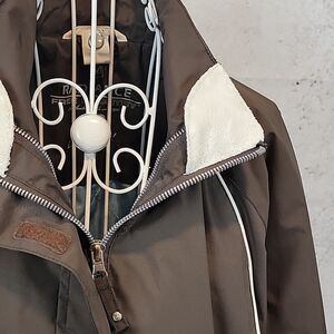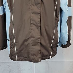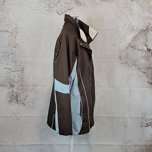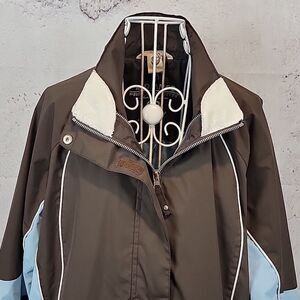 This wear anywhere jacket by Free Country is wind and water resistant with storm collar, front zip pockets, and a pretty brown and blue color combo. Good pre-owned condition, but this is the outer shell only. It's missing the zip in inner fleece option.