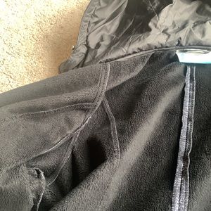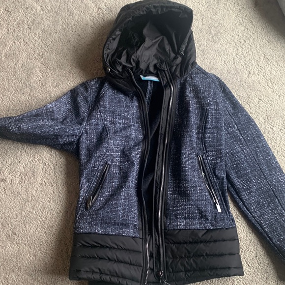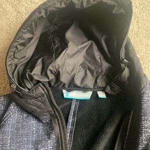 Full Zip, Fleece-lined Hooded jacket. Color is grayish blue.