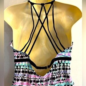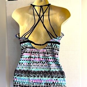 Free Country in multi color with strappy nice back detail, great top support, & adjustable straps. 82%nylon & 18% spandex. Pre owned tankini top in great condition