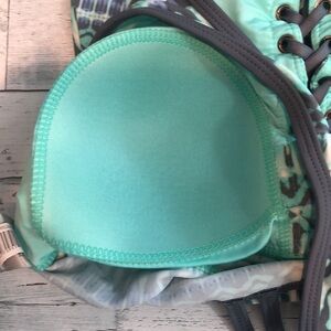 Mint with silver gray trim, yellow, blue, criss cross tie at chest, open racerback, padded bra,colors may vary due to lighting, size: S