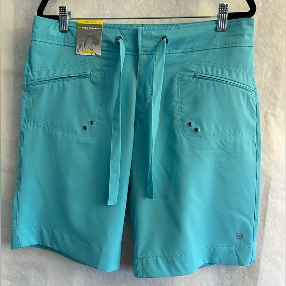Stylish aqua (almost tiffany blue) bermuda board shorts by Free Country. Features zipper with slide hooks and drawstring waist to adjust fit.Bonus: zippered pockets. Perfect for pool, beach, or casual wear.