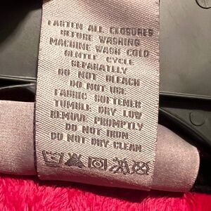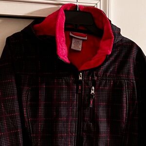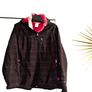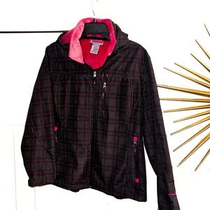 Zippered pockets, removable hood, Fuscia interior. Could be lightweight ski jacket. Or daily jacket. Back background with grey and fuscia plaid
