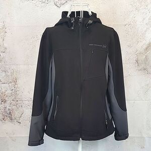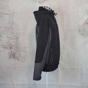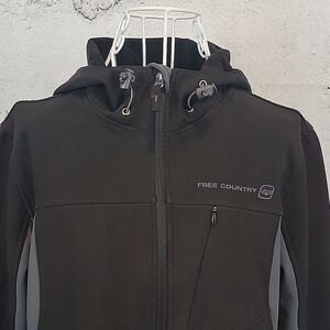 Conquer the elements in style with this soft shell jacket by Free Country with a soft lining, attached hood with draw cord, full zipper front, and zip pockets. Great pre-owned condition with normal signs of wash and wear. Check measurements for size it might run a little small.