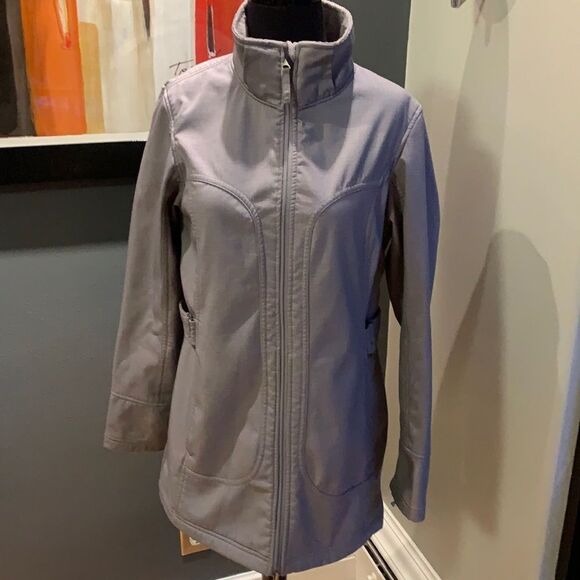 Free Country heather gray faux fur lined Moyen zip jacket. Subtle scratched lines pattern. Half belt at sides with burnished silver hardware. Lower front in seam zipper pockets. Lots of topstitched seam details. Zipper garage at neckline. Polyester/spandex blend. Medium. Excellent condition. Nonsmoking home.